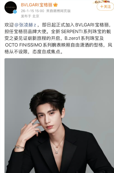宝格丽在2026年1月15日官宣张凌赫成为品牌大使,这次合作直接跳过考察期,堪称内娱顶流的"高光时刻"。
